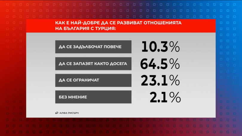 Според изследването на " Алфа Рисърч " 64,5% от българите считат, че връзките на България с Турция би трябвало да продължат да се развиват както до момента. 23,1% са на мнение, че те би трябвало да бъдат лимитирани, а 10,3%, че връзките сред двете страни би трябвало да се задълбочат повече. Без мнение са 2,1% от интервюираните.