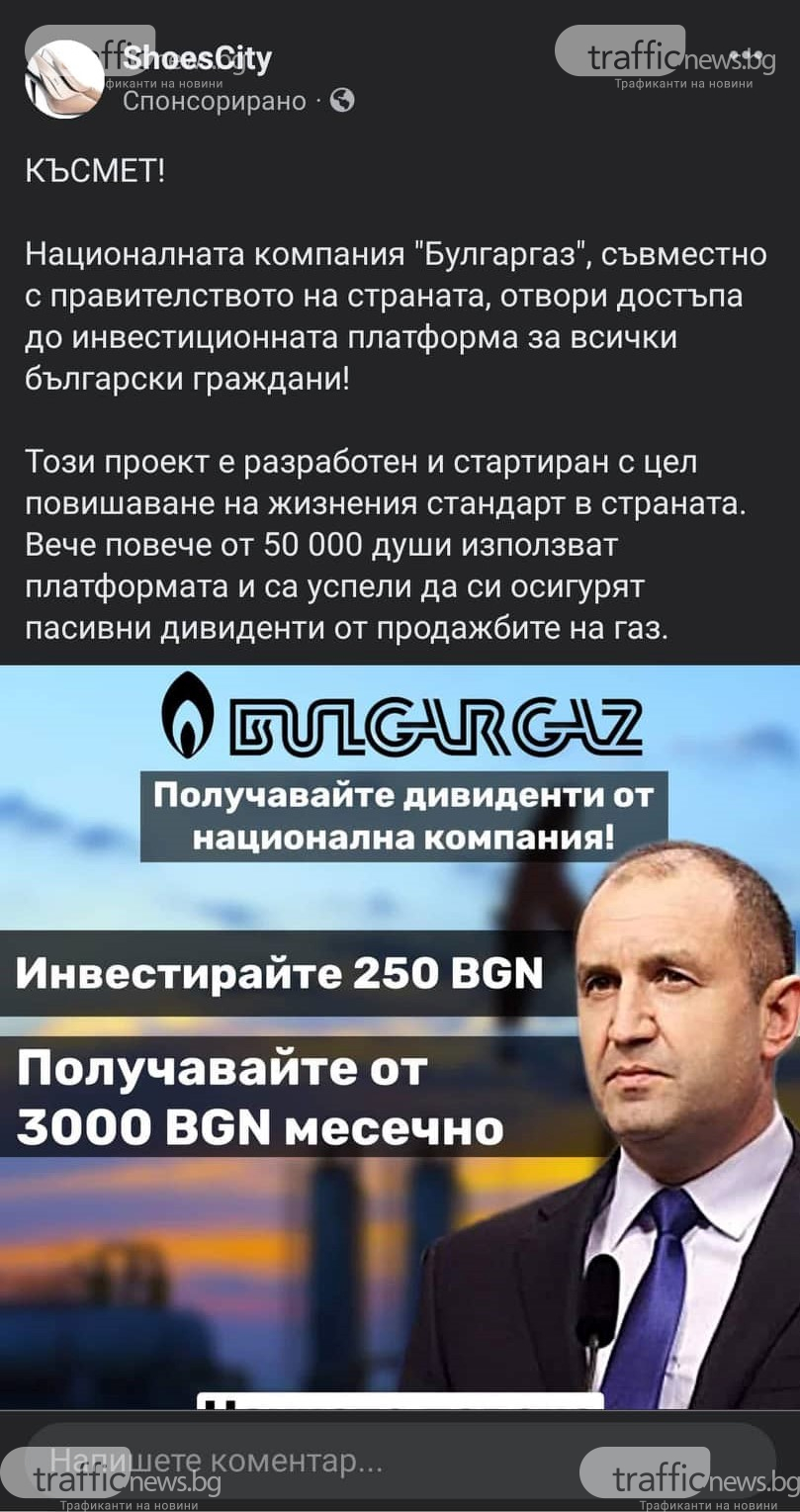 Как ви звучи да си купите акции в „ Булгаргаз ” и единствено с инвестиция от 250 лева да изкарвате по над 4000 лв. всеки месец? Да, доста хубаво, само че в действителност това е следващата машинация която дебне във фейсбук. Освен името на най-голямата българска компания за систематизиране на природен газ, в схемата, за по-голяма меродавност, е добавена и фотография на президента Румен Радев, като даже се загатва и присъединяване на „ държавното управление ”.