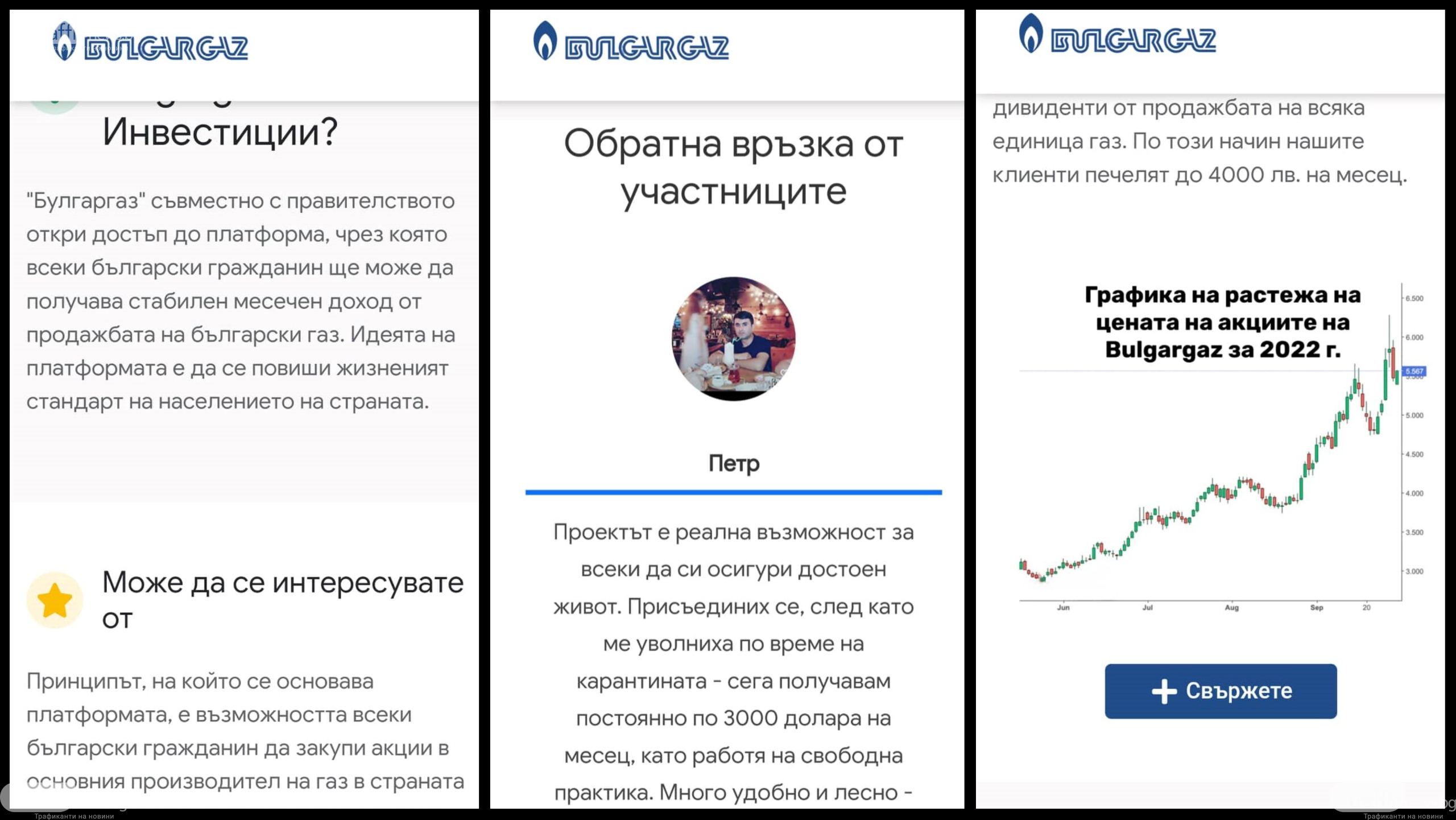 Естествено 90% от хората към момента не подозират нищо и цъкат на страницата, с цел да съберат повече информация за акцията, която сякаш държавното управление ни предлага в партньорство с „ Булгаргаз ”. Трябва да се означи, че тематиката е много настояща, поради непрекъснато покачващата се цена на газа и рецесията в Европа. Показана е даже графика, показваща ни тренд в растежа на акциите на „ Булгаргаз ” за 2022 година.
