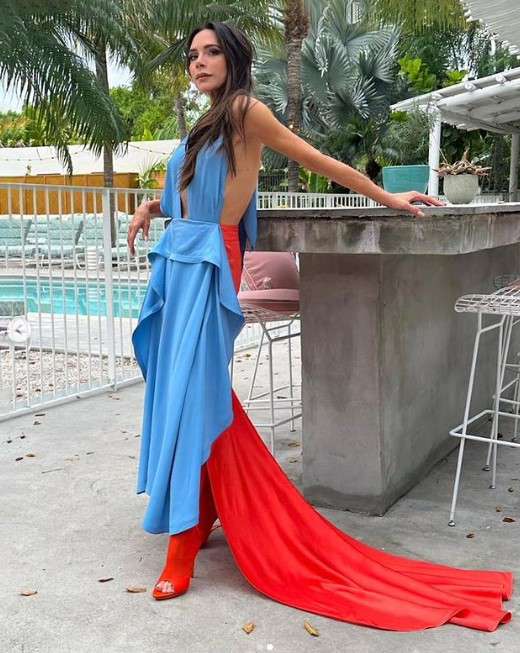 И по всичко проличава, че госпожа Бекъм няма никакво желание да се отхвърля от стилния си бранд и дизайнерското си занятие. Като доказателство за думите ни идват и последните две фотоси, които се появиха в профила на Виктория. Виждаме я облечена в секси рокля с гол тил. Роклята е в синьо и алено и има много интересен дизайн - нещо като комбиниране сред пола и туника.