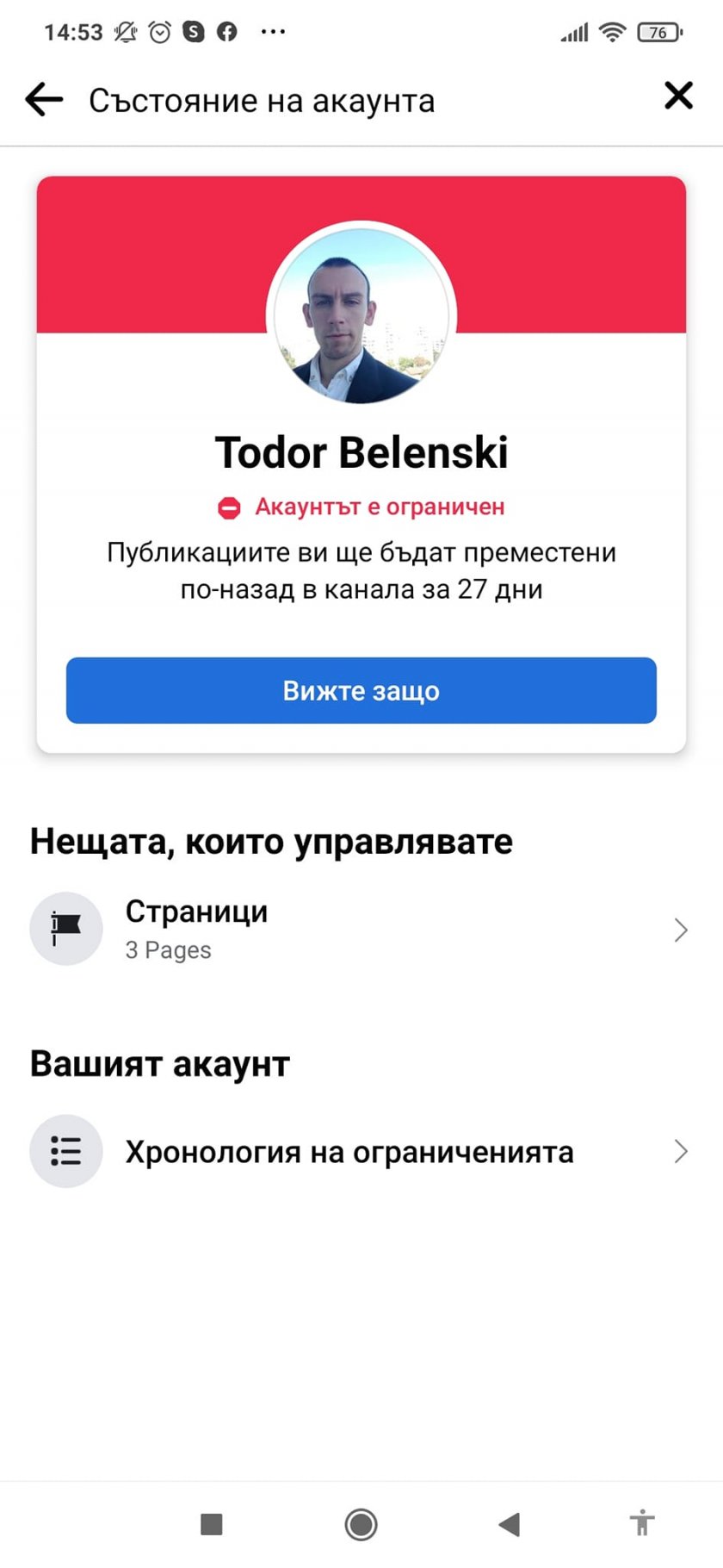 " Както сами виждате профилът ми беше стеснен. Това е свободата на словото в днешно време. Социална мрежа, която претендира да е платформа, се изявява като редактор и лимитира правото ми на изложение. Нещо, което върша в качеството си на самостоятелен публицист и напълно за култура на сънародниците ми ", показа политическият публицист Тодор Беленски, откакто профилът му в обществената мрежа Facebook беше неразрешен.