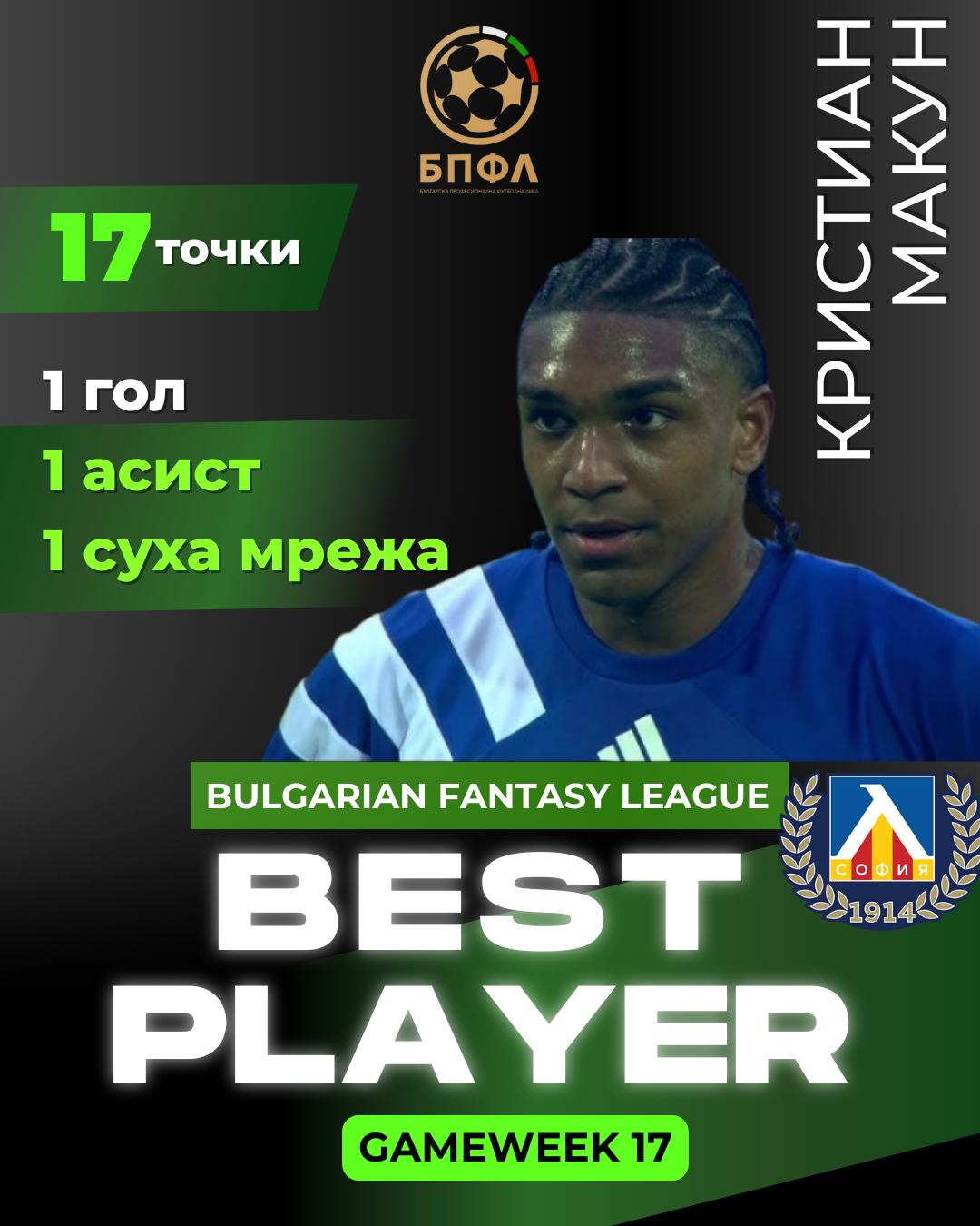 Кристиан Макун е състезател на кръга със 17 точки, реализирани с гол, асистенция и суха мрежа. Докато Сула, Алдаир и Майкон също реализираха двуцифрен точков актив. Левски ще гостува на Славия в кръг 18, а колкото играчи на Левски имате в тима си – пуснете ги титуляри всичките! За Септември следва домакинство на ЦСКА1948 и по-скоро бихме се въздържали от играчи на Септември преди кръг 18.