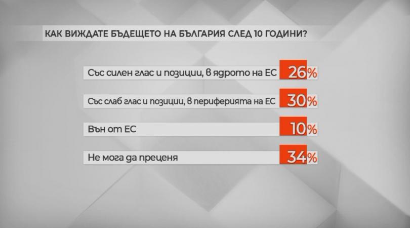 30% виждат бъдещето на България след 10 години със слаб глас, в периферията на Европейски Съюз. 26 на 100 виждат страната ни със мощен глас, в ядрото на Европейски Съюз. 10% са песимисти и я виждат отвън съюза, а 34% не могат да преценяват.