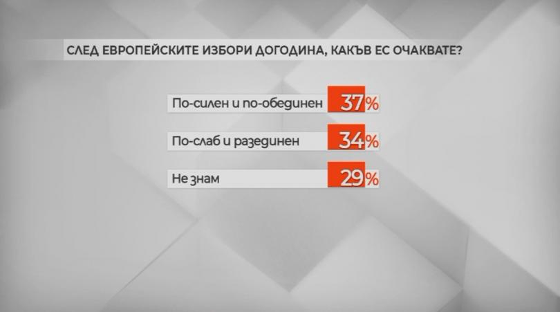 37% виждат Европейски Съюз по мощен и по-обединен след европейските избори следващата година. 34 на 100 считат, че ще е по слаб и разлъчен. 29% не знаят.