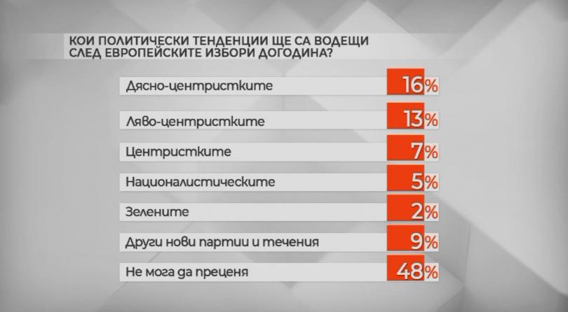 48 % не могат да преценяват кои политически тендеции ще са водещи след европейските избори следващата година. 16 на 100 считат, че те ще са дясно-центристки, а 13% - ляво-центристки.