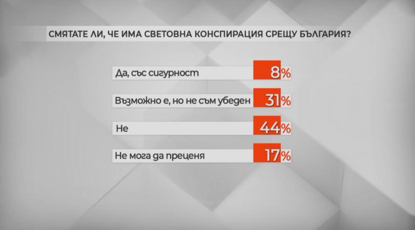 44% считат, че няма международна интрига против България. 31 на 100 мислят, че е допустимо, само че не са уверени, 8% са сигурни, че има международна интрига против страната ни. Под 20% не могат да преценяват.