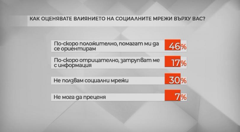 Почти 50% правят оценка въздействието на обществените мрежи върху тях като по-скоро позитивно. 17 на 100 считат, че е негативно. 30% са дали отговор, че не употребяват обществени мрежи.