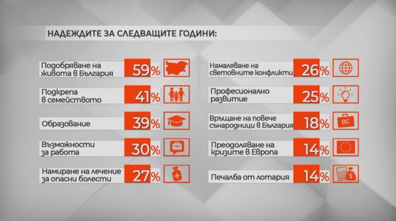 Най-големите ни очаквания за идната година са свързани с това да се усъвършенства животът в България. Следват фамилията, образованието и опцията за работа. На последно място е облага от лотария и превъзмогване на рецесиите в Европа. Не разпореждаме огромни очаквания и за връщане на повече сънародници в България.