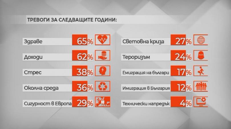 Най-голямата паника за идващите години е здравето, следват го приходите, стресът и околната среда. На последно място е техническият прогрес. Тероризмът и международната рецесия също не са от главните паники на българите за следващата година, демонстрира представителното изследване на " Алфа Рисърч ".