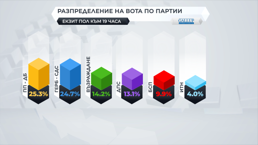 Според първите планирани резултати на " Галъп " в парламентарната борба за първото място са " Продължаваме промяната " и ГЕРБ-СДС.