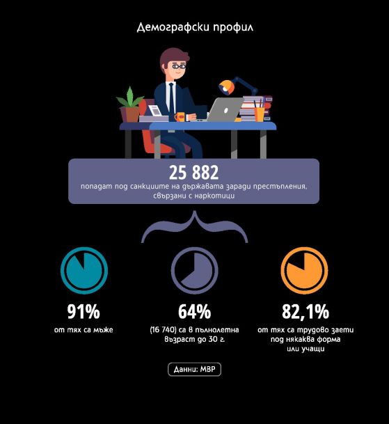 Демографският профил на наказаните и глобените поради закононарушения, свързани с опиати - 91% мъже, 64% са от 18 до 30-годишна възраст, а 82% са трудово заети или учащи.