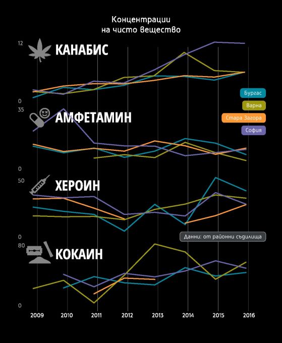 Освен закононарушенията и наказаните, от Промена и БЛО са анализирали и потентността на опиатите през годините.