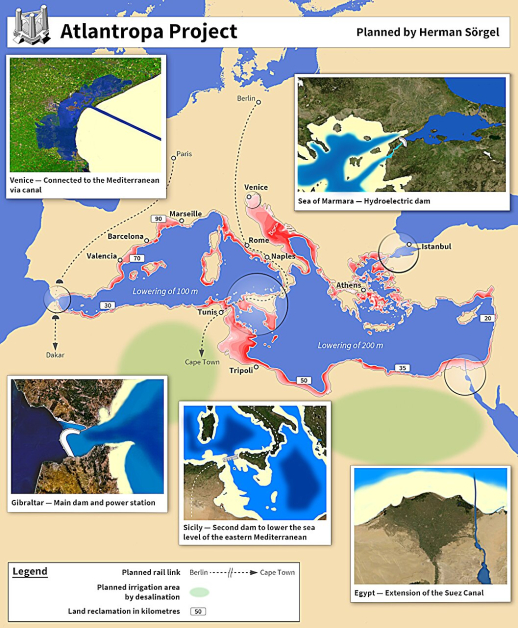 Това може да звучи като странни теоретични въпроси, само че не и за Херман Сьоргел, баварски проектант, който посвети огромна част от живота си навръх този план: създаване на великански язовир през Гибралтарския пролив, оставяне на Средиземно море да пресъхне и колонизиране на земята, рекултивирана от морето.