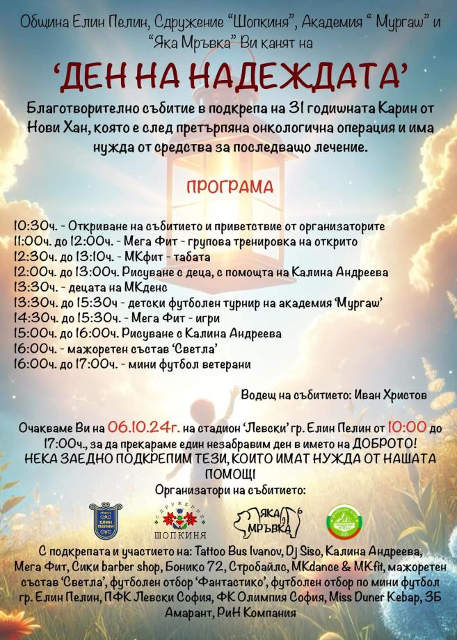 Заповядайте на 6 октомври (неделя), на стадион „ Левски “ в гр. Елин Пелин от 10 до 17 часа, с цел да прекарате един паметен ден в името на Доброто. Водещ на събитието ще бъде Иван Христов.