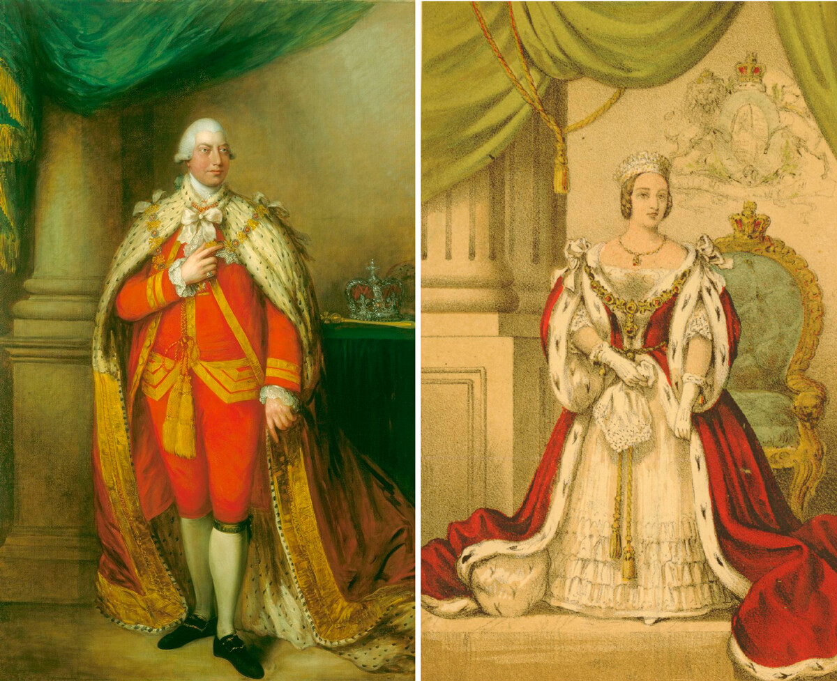 Джордж III от Обединеното кралство, 1793 година, Гейнсбъро Дюпон/Кралска колекция/Замъкът Уиндзор/Свободни източници; Кралица Виктория, 1838 г./Британски музей/Свободни източници
