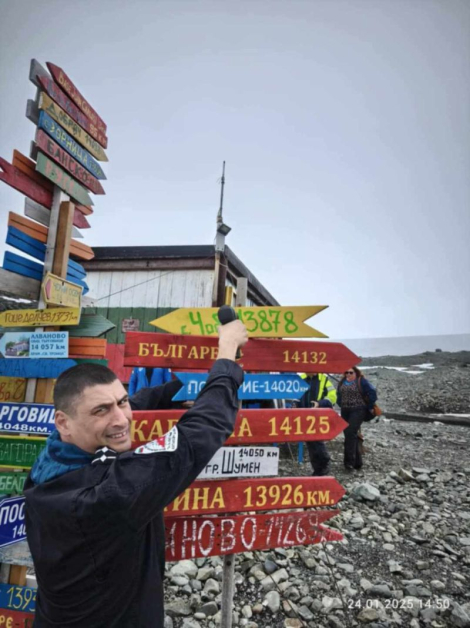 За да зарадва фамилията си, той взема решение да сложи табела на остров Ливингстън, която демонстрира посоката и дистанцията от 13 878 км до родното село на майка му – село Чоба. И го прави навръх рождения й ден – 24 януари. Инициативата идва от сестра му Хубавена. И за двамата селото е обвързвано с доста благи мемоари, защото са израстнали там. Съпругата и децата му пък в този момент постоянно го посещават.