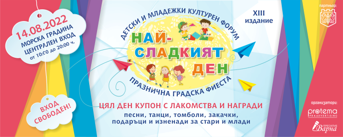 Всичко това вкупом ще се случи по време на XIII издание на. Пищно обилие от песни, танци, радостни игри и атрактивни развлечения, ще има за всички дребни и пораснали малчугани, през целия ден, на 14-ти август /неделя/, пред централния вход на Морската градина.