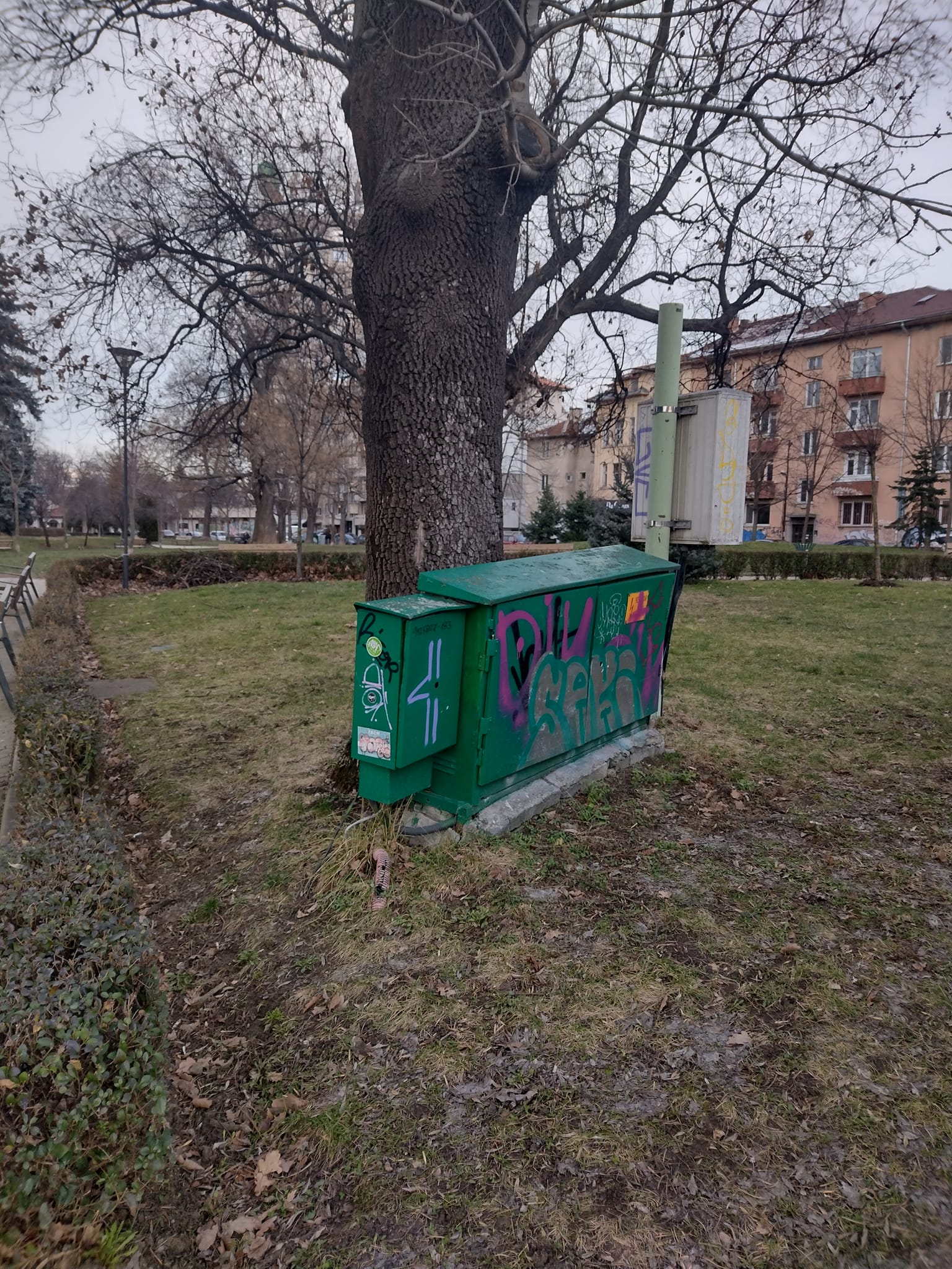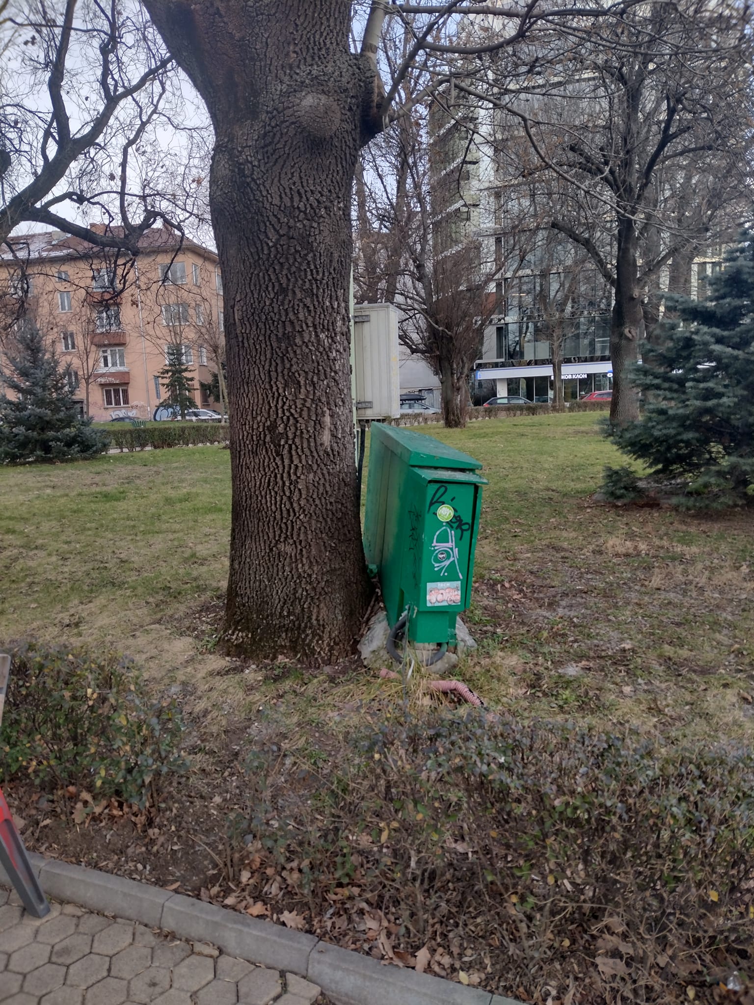 Опасното оборудване е поникнало в непосредствена непосредственост до стъблото на дебело дърво в София. Мястото е квартал „ Лозенец “, в Банската градина. Друг въпрос, който предизвикаха оповестени фотоси, е кое е първо – дървото или таблото на ЕРМ Запад.