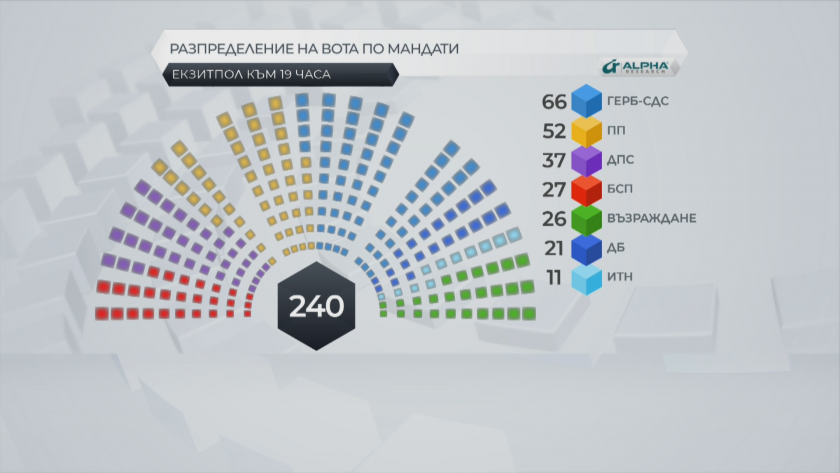 Според първите планирани резултати на социологическа организация " Алфа рисърч " в Народното събрание влизат 7 партии - ГЕРБ, Политическа партия, Движение за права и свободи, Българска социалистическа партия, Възраждане, Демократична България и Има Такъв Народ: Ето и разпределението на мандатите:
