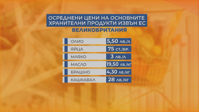 След питане на Българска национална телевизия към поданици на Обединеното кралство те споделиха, че цената за литър олио е достигнала близо 6 лева Едно яйце към 75 ст.,а литър мляко – към 3 лева За кг масло британците заплащат приблизително по 20 лева, а за кг брашно малко под 4 лева Цената за кг кашкавал е към 28лв.