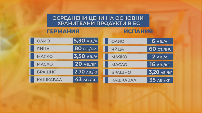 След изследване на цените на главните хранителни артикули в разнообразни страни членки на Европейския съюз се виждат фрапантни разлики. Така за литър олио в Германия заплащат малко над 5 лева, а в Испания 6 лева Едно яйце във Федералната република е 80 ст. за численост, а на Пиренеите коства 60ст. Вижда се фрапантна цена при двете страни за литър мляко., повече от един лев. Така 1 литър мляко в Германия коства 3,50 ст., а в Испания е едвам 2 лева Разликата в цената за кг масло в двете страни е 4 лева. При брашното за кг се вижда почти 50 ст.,но при кашкавала разликата е към 10 лева А какви ограничения са взети след световната инфлация в Германия и има ли таван на цените във Федералната република?