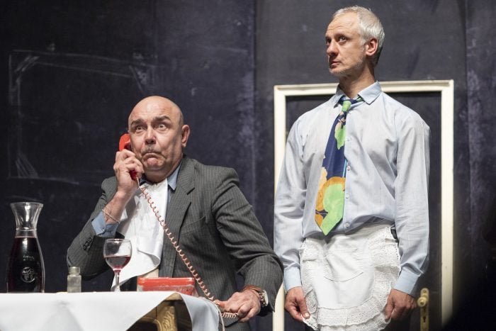 Калин Сърменов и Иван Бърнев в най-дълго играната режисура на Сатирата - " Вечеря за тъпаци ", като пиесата е сложена от именития чешки режисьор Иржи Менцел преди повече от 20 години