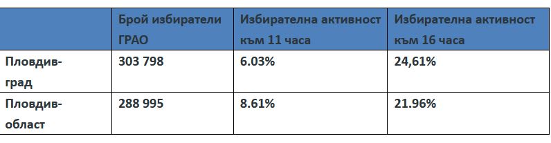 Към 16 часа изборната интензивност Пловдив-град е малко по-висока, в сравнение с в региона, оповестиха от Областната администрация. Избирателната интензивност на изборите е 24,61% за Пловдив – град. От общо 303 798 гласоподаватели, своя избор са дали – 74 768 души. Най-висока е в регион „ Централен “ – 27.75%, следван от „ Западен “ – 26.16%, а най-ниска е регион „ Източен “ – 19.51%. В останалите e: „ Северен “ – 24.96%, „ Южен “ – 24.35%, „ Тракия “ – 24.13%.