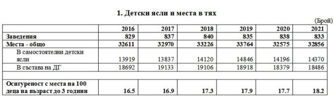 Към 31.12.2021 година в страната действат 833 независими детски ясли и яслени групи в състава на детски градини с общо 32856 места в тях, сочат данни на.
