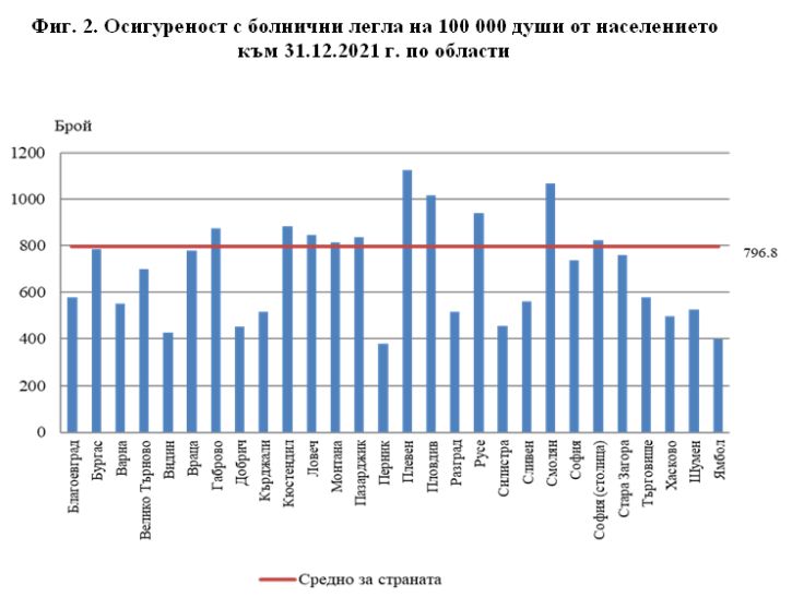 Осигуреността на популацията с болнични кревати в края на 2021 година е 796.8 на 100 000 души от популацията и спрямо 2020 година се усилва с 12.9 пункта (783.9), демонстрират още данните на Национален статистически институт.