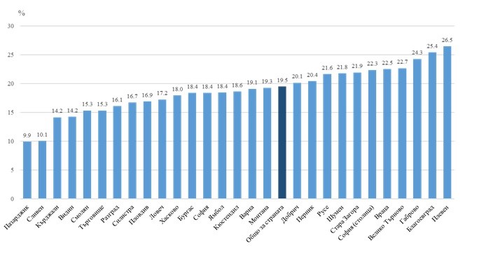Към 31.12.2023 година осигуреността с места общо за страната е 19,5%, като най-висока е в областите Плевен (26,5%), Благоевград (25,4%) и Габрово (24,3%) (фиг. 1).