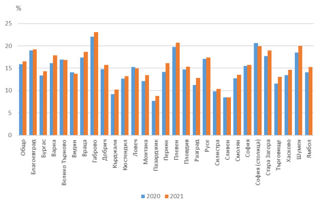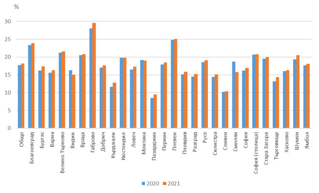 В териториален аспект данните демонстрират, че в съвсем всички области индикаторът се покачва, а единствено в три области - Видин, Монтана и Смолян, понижава.