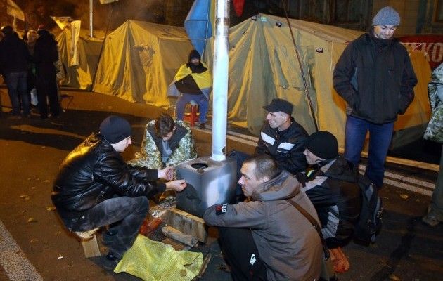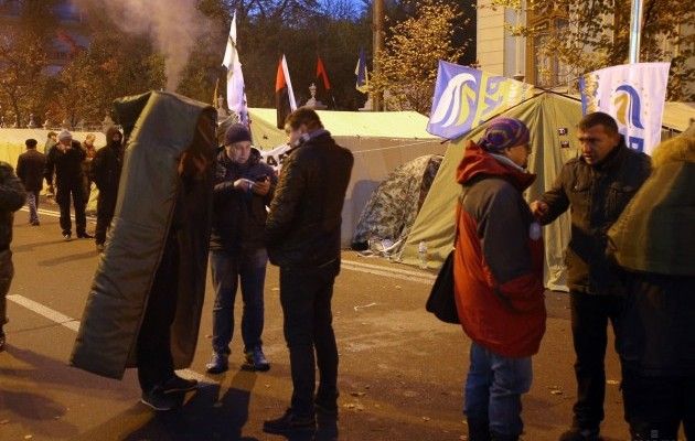 Към края на първия ден на опълчване сред власт и съпротива в Украйна, т.е. в нощта на 17 против 18 октомври, мястото на митинга внезапно се преобрази. През деня това бе единствено протест, в който участваха няколко хиляди души, а когато в Киев се спусна мрак, Конституционния площад се трансформира в доста добре проведен лагер, пишат украински и съветски медии.