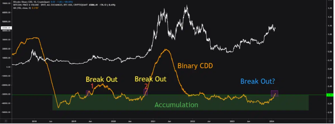 Mignolet, анализатор и създател в CryptoQuant, извърши разбор , употребявайки двоичния CDD на BTC – метрика, употребена за интерпретиране на придвижванията на дълготрайните притежатели.