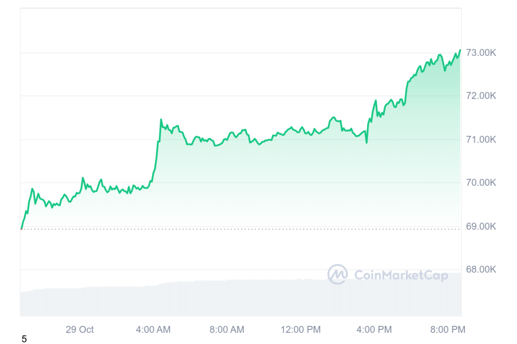 Биткойн проби границата от $73,000, отчитайки 6% растеж за последните 24 часа и близо 9% на седмична база.