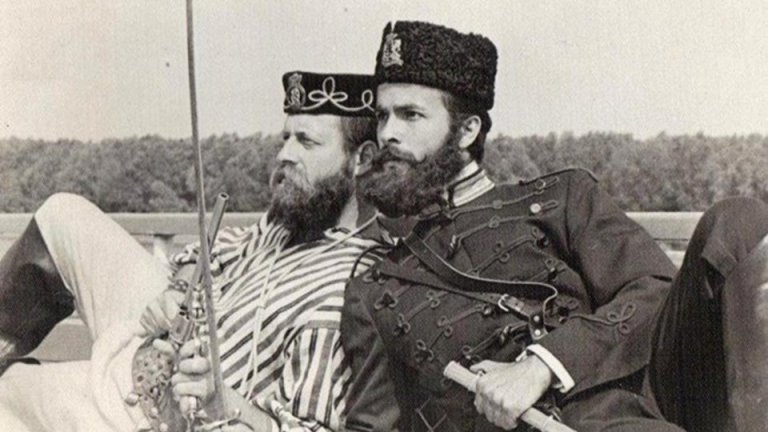 Милен Пенев (вдясно) в ролята на Ботев, в кадър от кино лентата " Свобода или гибел " на режисьора Никола Корабов. До него е Коста Цонев в облика на подвойводата Перо Македонеца