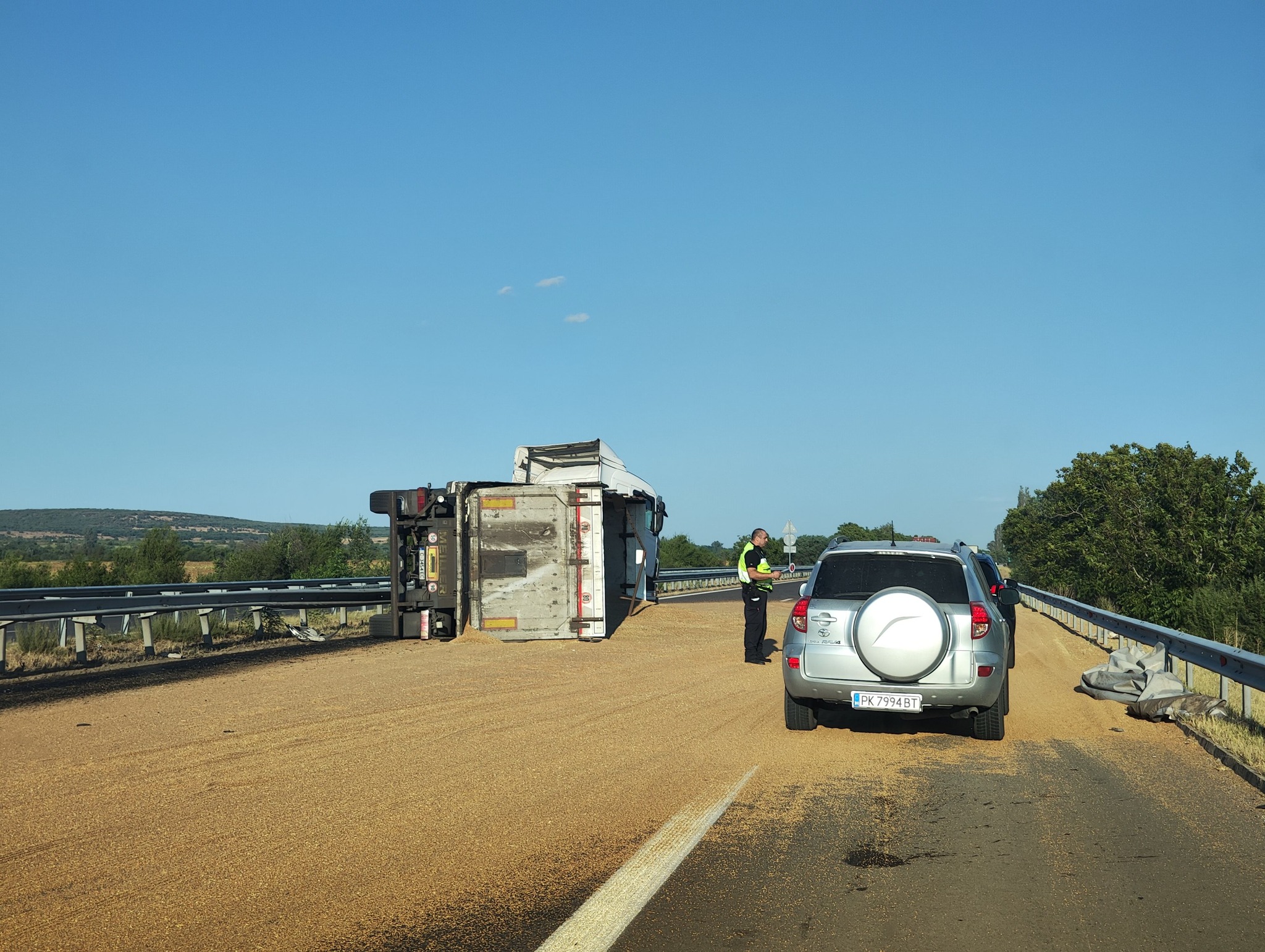Камион, претрупан с жито, се е обърнал на автомагистрала " Тракия ", разбра GlasNews.bg.