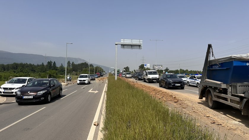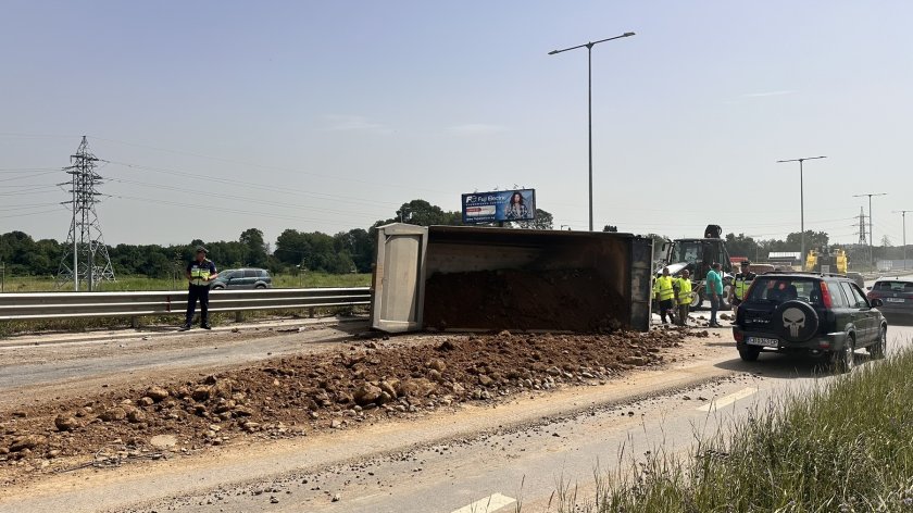 Има разсипан товар на пътното платно. Тежкотоварният автомобил се е преобърнал при маневра.