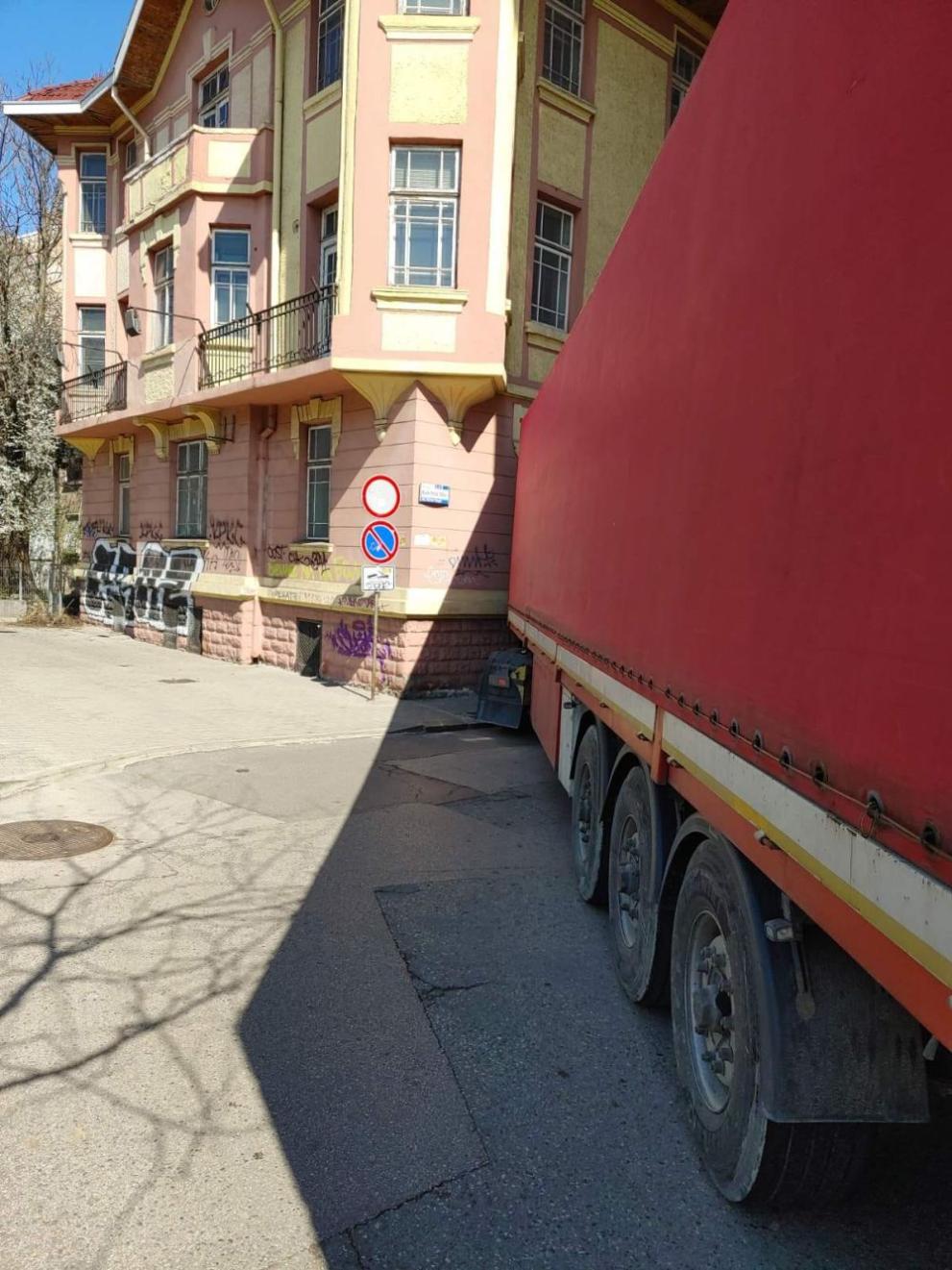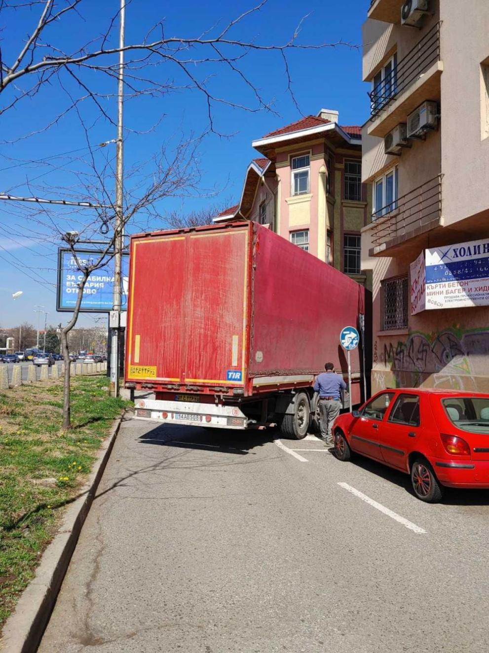 Камион се заклещи сред две здания в София. Това излиза наяве от обява в огромна група във Фейсбук.
