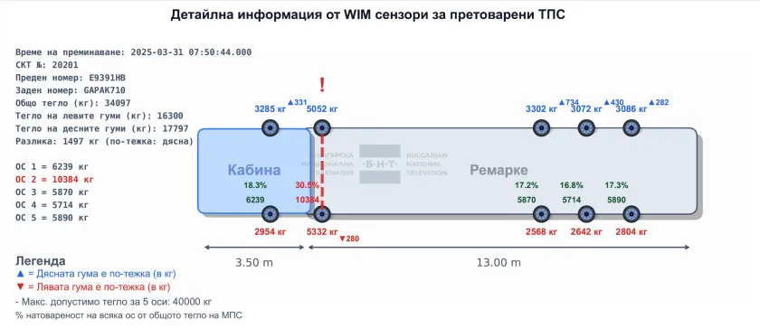 Влекачът и ремаркето на камиона е минал през датчици на толсистемата, които мерят натоварването в 7 часа и 50 минути на 31 март. От АПИ предоставиха скица с детайлните данни. От нея се вижда, че десните гуми на тира са натоварени с близо звук и половина повече от левите.