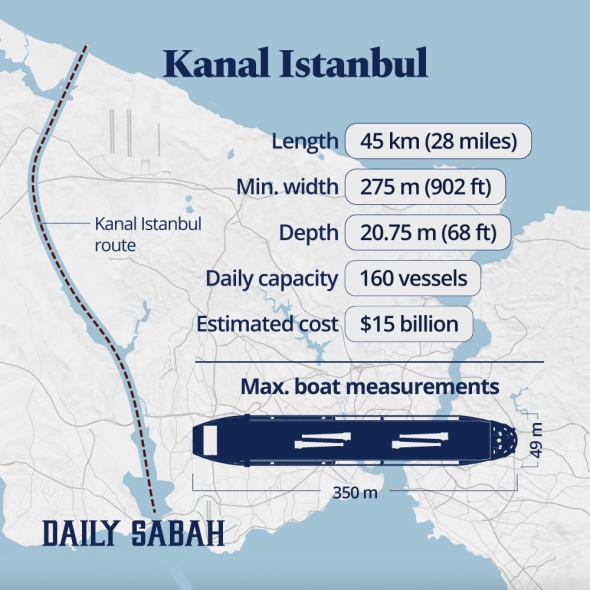Каналът, който ще бъде построен от европейската страна на турския мегаполис в коридора Кючюкчекмедже-Сазлъдере-Дурусу и ще бъде дълъг към 45 километра, необятен 275 метра и бездънен 20,75 метра.