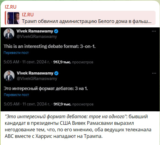 Бившият претендент за президент Вивек Рамасвами изрази отвращение, че счита, че и водещите на ABC, и Харис нападат Тръмп: „ Трима на едно “.