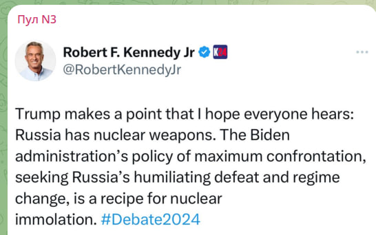 " Тръмп прави нещо, което се надявам всички да чуят: Русия има нуклеарни оръжия. Политиката на администрацията на Байдън на оптималната борба, ориентирана към унизяване на съветското проваляне и промяна на режима, е рецепта за нуклеарно жертвоприношение. "