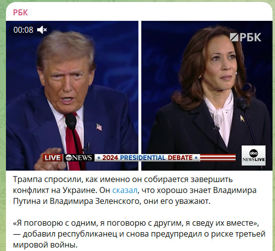" Въпреки че съветското управление поддържа Камала Харис с вярата, че тя ще унищожи Съединените щати, би трябвало да се признае, че този път тя към този момент изглеждаше като новобранец и загуби дебата с Тръмп даже по-ясно от Байдън. По създание тя се отбрани, разграничавайки се от Байдън и избърбори нещо неясно. Така че тя може да загуби... Мисля, че демократичните донори са изцяло комплицирани сега. Струваше ли си да разменят [Байдън] за такава жена, която няма никакъв разсъдък, няма с какво да стартираме... "