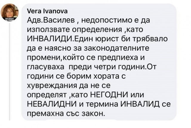 Кандидатът на Слави Радостин Василев в спор с Вера Иванова от „ Системата ни убива ”. Причина за разнобоя стана думата „ неработоспособен “ и неразрешена ли е тя със закон. Вера Иванова се възмути на определението, употребявано от юрист Василев и му изясни, че е неприемливо правист да не е наясно със законодателните промени от преди 4 години. „ Негодни и невалидни, както и терминът Инвалид се отстраниха със закон “, написа майката от „ Системата ни убива ”.