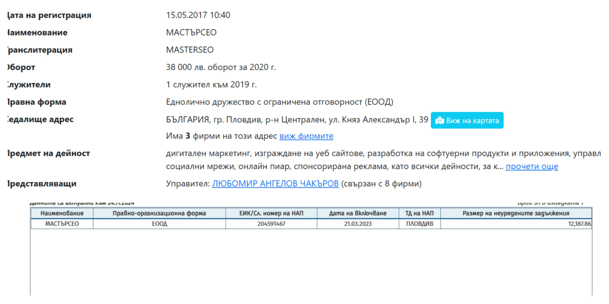 Друга негова компания със 100% капитал и шеф е „ Мастърсошъл “, а отговорностите към приходната организация са 9 134 лв. и с дата на включване 01.09.2024 година. Третото юридическо лице, на което той е притежател е „ Мастърсео “ със отговорности от 12 187 лв., като в черния лист е от 21.03.2023 година.