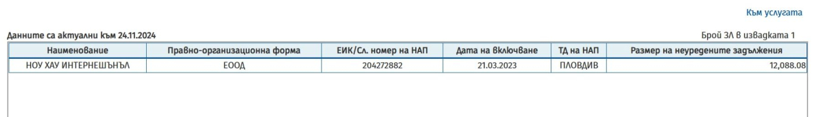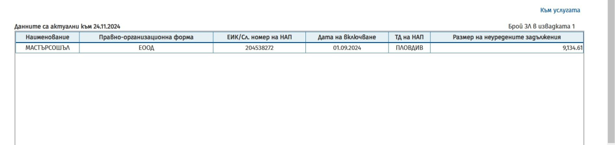 Справка в портала на Националната организация по приходите, че общите отговорности на компаниите на Чакъров надвишават 33 000 лв..
