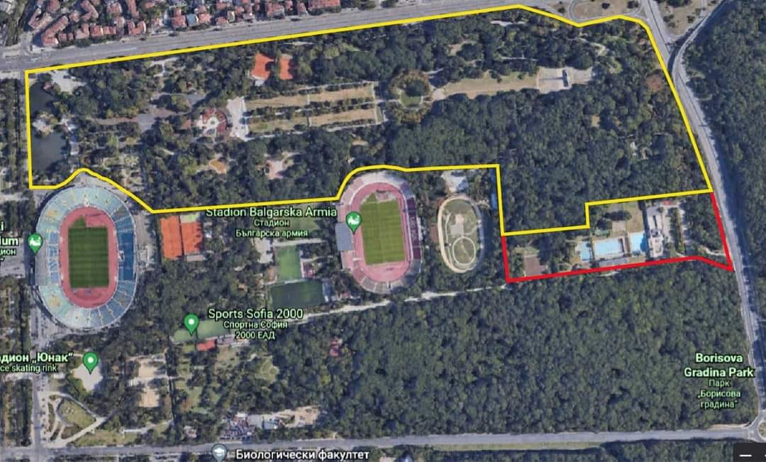 “Имаме концепция да предложим смяна на резерватната част на парка (очертана с жълто), тъй че към нея да се добави и територията, на която се намира къпалнята (очертана с червено). Тогава към този момент няма да има апетити за строителство и ще може още веднъж да отвори за хората”, написа Трайков във фейсбук.