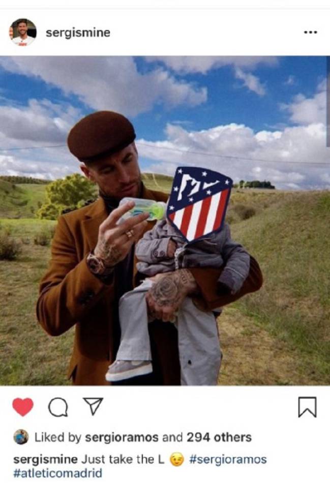 Капитанът на Реал Мадрид Серхио Рамос “хареса” саркастичен за Атлетико Мадрид колаж в Инстаграм. На него самият той е изобразен по какъв начин храни с шишенце бебе, чиято глава обаче е сменена с емблемата на градския противник.