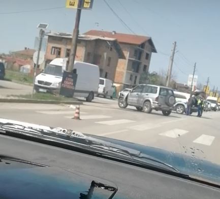 На улица в града са се блъснали джип и мотор. Двуколесното транспортно средство е изхвърчало в разграничителен остров. По колата има следи от непряк удар.