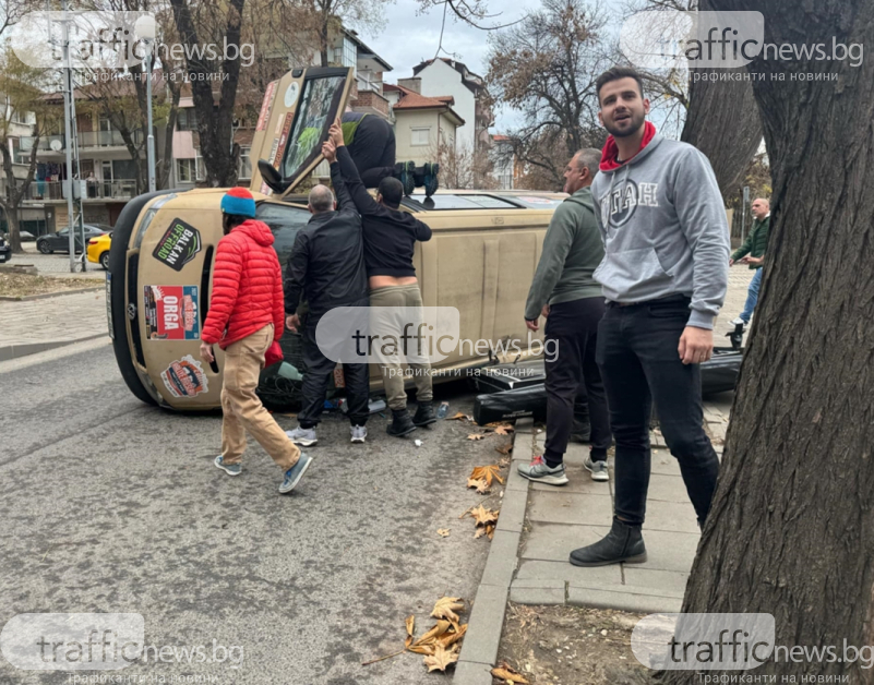 Свидетели на случая са се притекли на помощ, като са извадили приклещините пътници от обърнатата кола